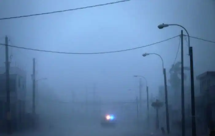 Одинокая полицейская машина патрулирует улицы Фахардоо, Пуэрто-Рико, во время урагана Ирма