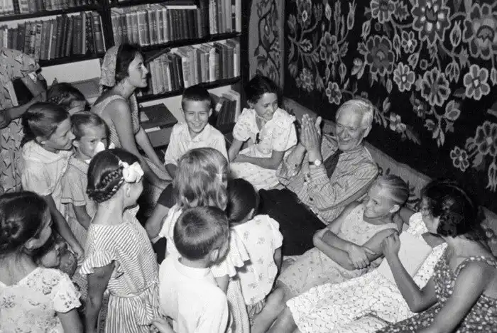 Корней Чуковский на своей даче в Переделкине с юными читателями