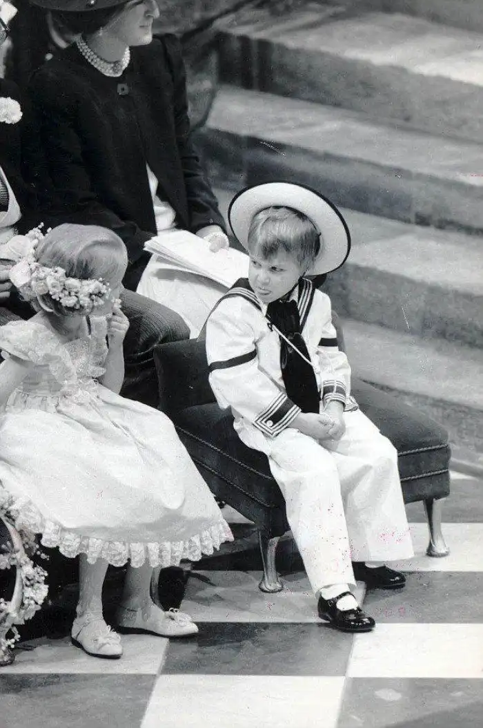 Четырехлетний принц Вильям строит рожи своей кузине Лоре Феллоус на свадьбе своего дяди принца Эндрю с Сарой Фергюсон.