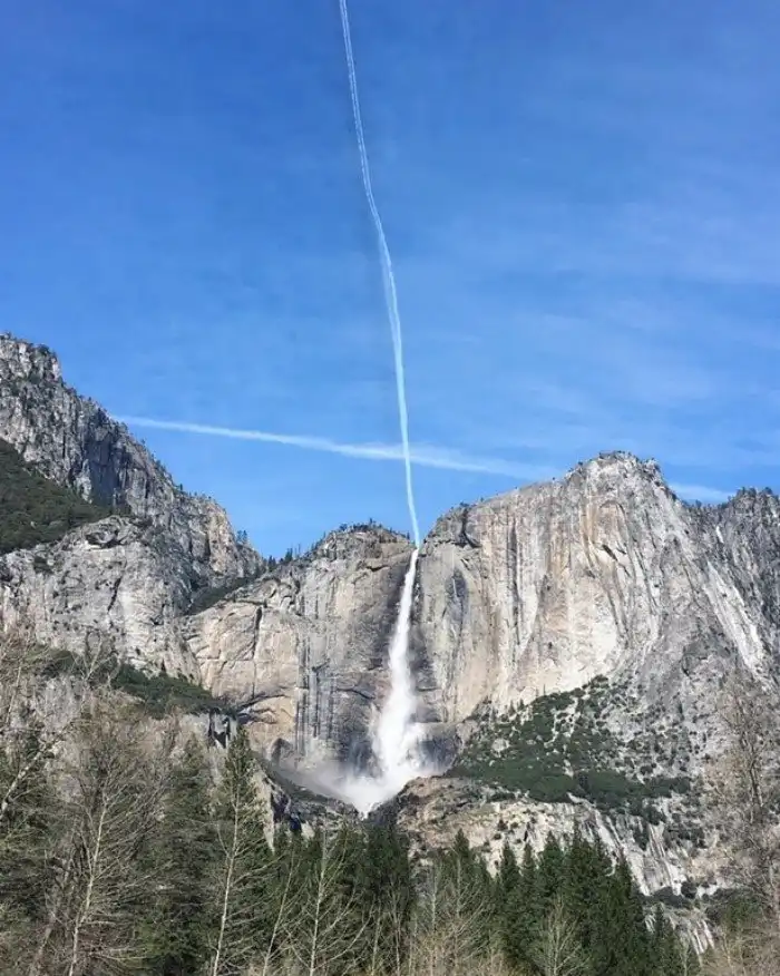 Водопад земной и водопад небесный. Точное попадание инверсионного следа самолета просто поражает!
