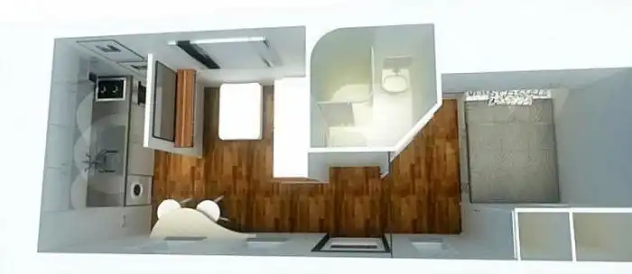 В нём есть отдельные помещения для гостиной и спальни, крошечная, но полнокомплектная кухня, где поместилась даже стиральная машина, и санузел.