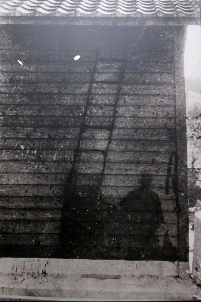 «Тень» ручки клапана на окрашенной стене резервуара с газом после трагических событий в Хиросиме. Радиационная жара мгновенно сожгла краску там, где радиационные лучи прошли беспрепятственно. 1920 м от эпицентра.