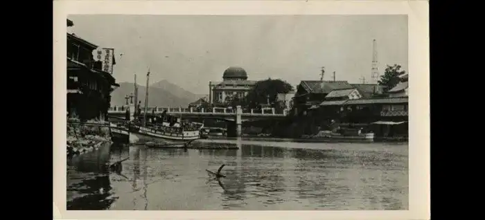 Фотография Хиросимы, сделанная до августа 1945 года. Вверх по течению реки Мотоясу к самому известному месту Хиросимы — куполу выставочного центра, находящегося в непосредственной близости от эпицентра. Первоначально это здание проектировал чешский архитектор Ян Летцель, оно было завершено в апреле 1915 года.
