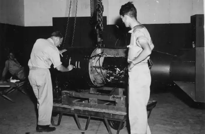Командир А.Ф. Бирч (слева) нумерует бомбу под кодовым названием «Малыш» перед погрузкой ее на трейлер в здании Ассамблеи №1 перед конечной погрузкой бомбы на борт бомбардировщика B-29 Superfortress «Enola Gay» на базе 509-й сводной группы на острове Тиниан у Марианских островов в 1945 году.