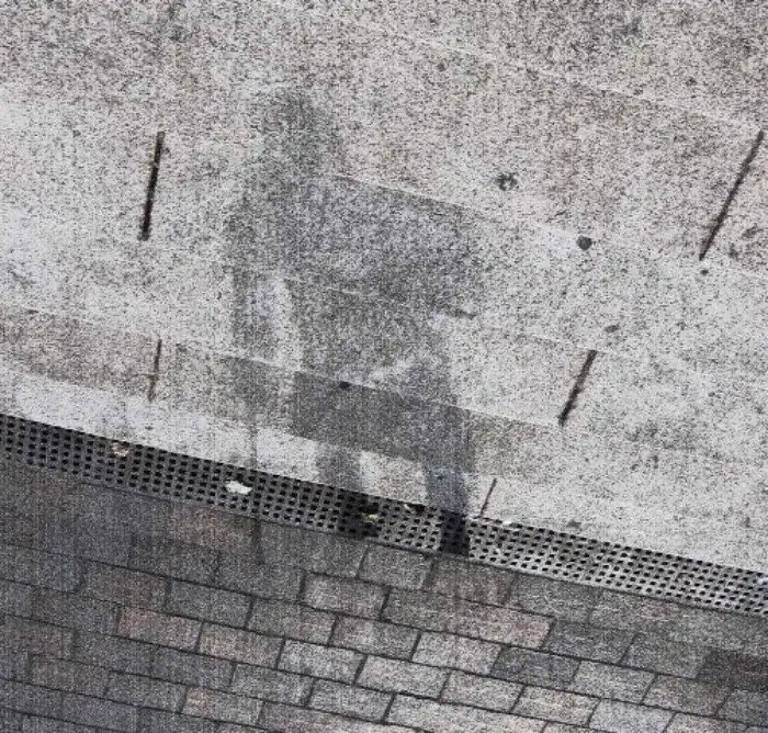 Фотография показывает, как на мраморных ступенях банка, по которым проходила женщина, остался только её след, выжженный страшным жаром.