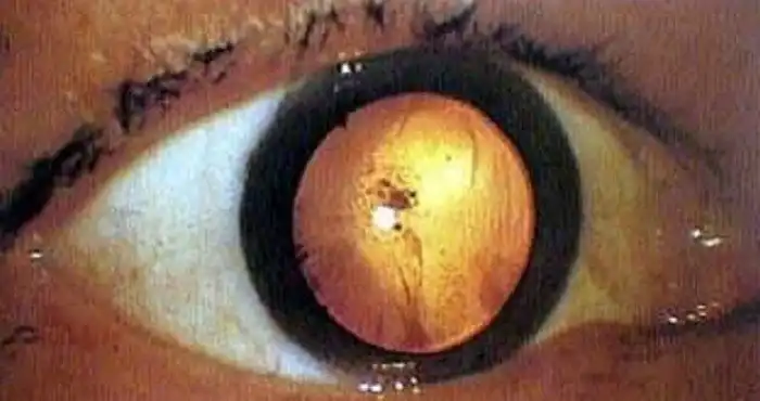 Фотография показывает приобретенную катаракту от вспышки взрыва атомной бомбы. Зрачок - это маленькая белая точка в центре глазного яблока.