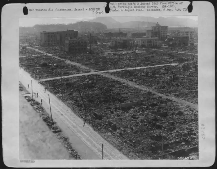 Вид эпицентра Хиросимы осенью 1945-го — полное разрушение после сброса первой атомной бомбы.