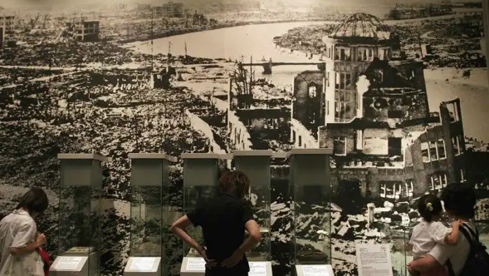 Часть панорамного вида уничтоженной Хиросимы, сделанного с помощью пяти фотоаппаратов с крыши здания Торговой Палаты 6 октября 1945 года, через 2 месяца после трагедии. Слева на заднем фоне развалины банка Геиби и госпиталя Шима. В центре разрушенное здание выставочного центра, за ним — мост через реку Матоясу, как раз перед гипоцентром взрыва.