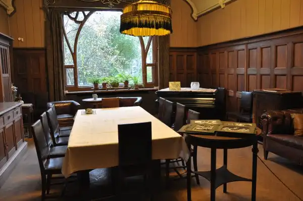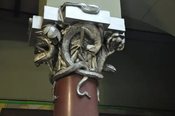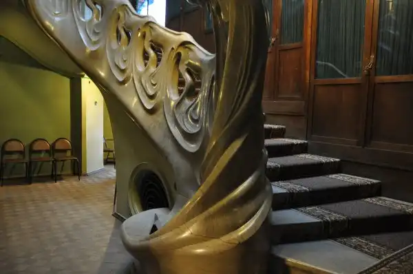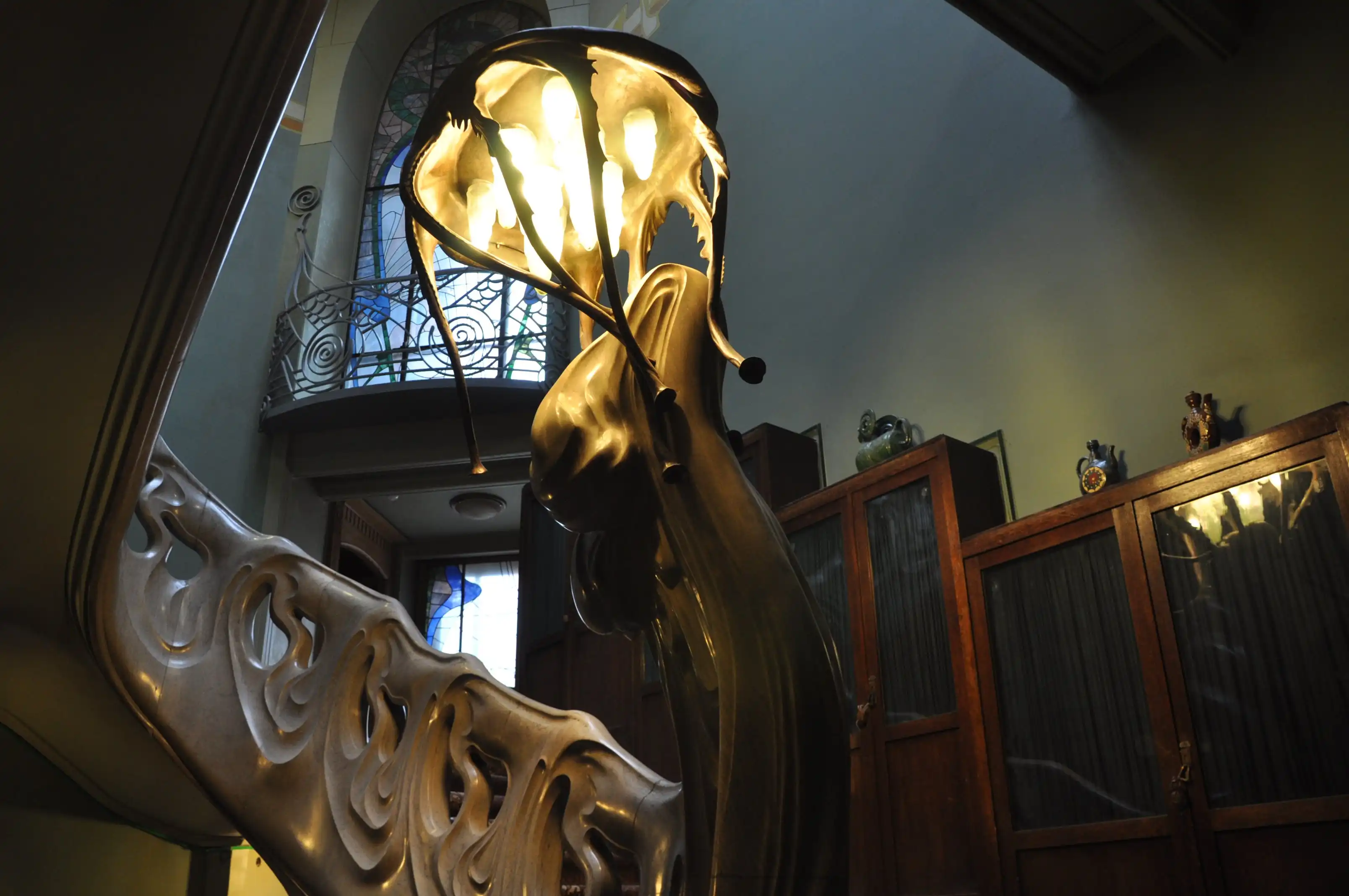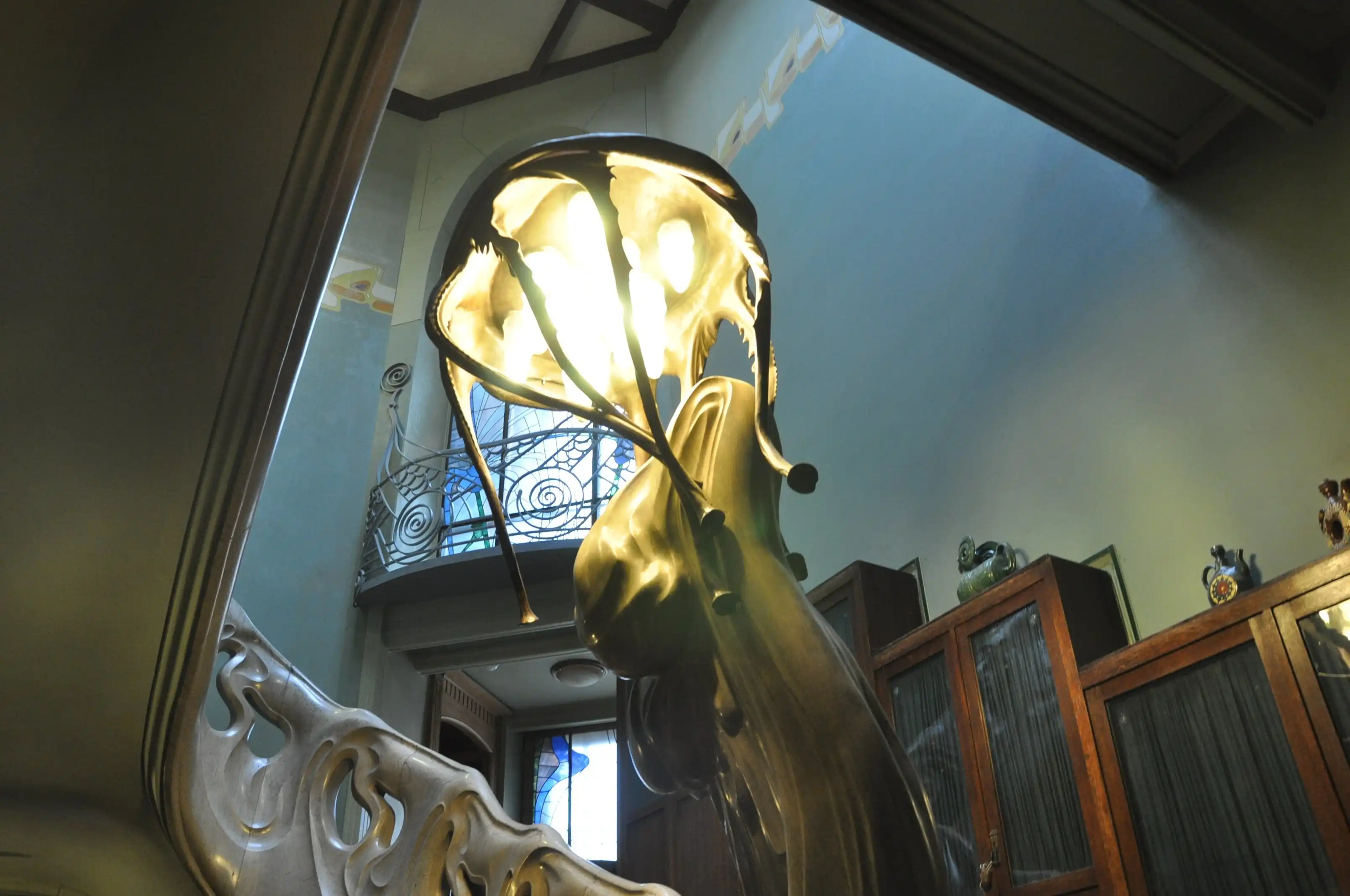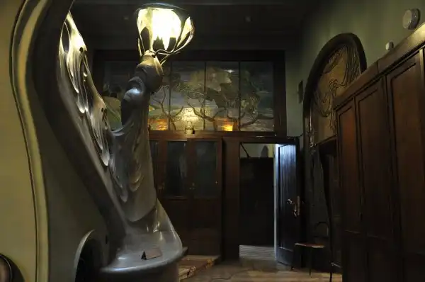 От Горького – громоздкая мебель сталинской эпохи, которая пришла на смену аутентичной, неизвестно кому и куда отошедшей, огромная библиотека, картины с видами острова Капри, семейные фотографии, коллекция нэцке и прочие экспонаты. Возможно, это даже интересно, если бы за этим мы шли сюда. Подозреваю, что здоровенные уродливые шкафы по стенам вдоль парадной ажурной лестницы на второй этаж – это тоже наследие Горького. Шкафы эти здорово загромождают изящное пространство лестницы и очень портят вид, хотя в основном на всех фотографиях их сначала не замечаешь – настолько завораживает красота самой лестницы и светильника-медузы . Ещё одно «горькое» наследие особняка – безвозвратная утрата оригинальных светильников, сделанных по эскизам Шехтеля и варварское уничтожение огромного камина из каррарского мрамора, на котором было вытесано изображение полуобнаженной женщины-бабочки с распахнутыми руками-крыльями. Чем он помешал Горькому? Говорят, молодые люди отвлекались на декор камина во время собраний кружка поэтов. К тому же, он был громоздким. Его место занял не менее громоздкий кожаный диван для гостей, ни к Шехтелю, ни к Рябушинским отношения не имеющий. Горький, говорят, вообще не любил этот дом, но когда он заявил Сталину, что предпочёл бы такому жилищу просто хорошую квартиру, то получил от великого вождя такой разнос, что больше попыток изменить свою участь не предпринимал.
