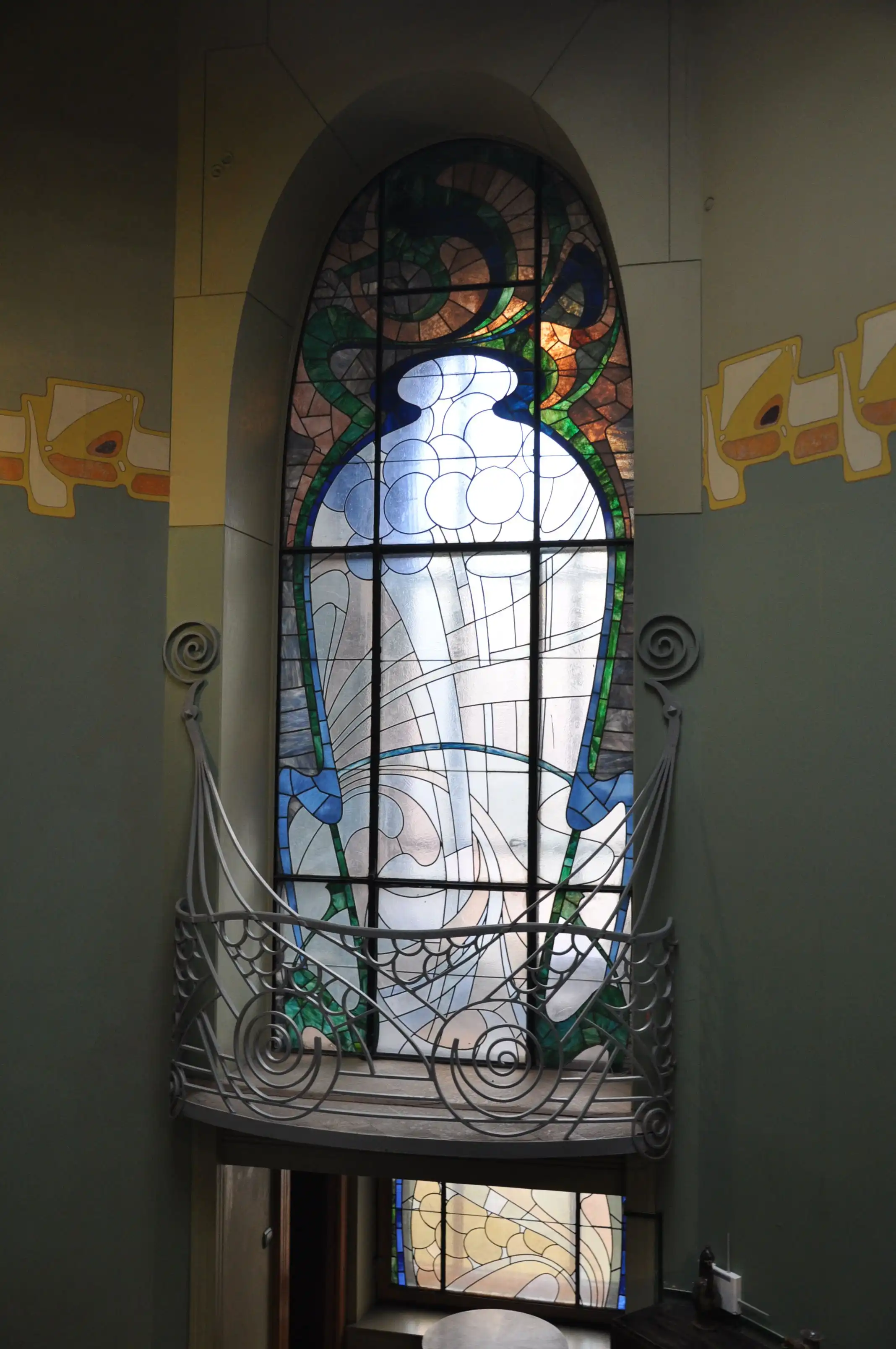 По рисункам Шехтеля художником С. А. Виноградовым были созданы девять витражей (в настоящее время для обзора доступны семь из них), которые выполняют не только декоративную роль, но и решают архитектурные задачи - внутреннее пространство используется с экономией и расширяется при помощи витражей. Так, большой пейзажный витраж с соснами и уходящими вдаль полями, создаёт иллюзию окна, увеличивая ограниченное внутреннее пространство. Этот витраж располагается напротив парадной лестницы, прямо над светильником-медузой , над дверью, ведущей от закрытого ныне парадного входа. Вид этой витражной картины в зависимости от освещения и точки обозрения постоянно меняется -она может быть то холодной синей, то ярко-желтой.