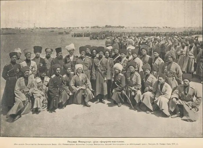 Император Николай II среди офицеров-пластунов. Фотография из журнала «Летопись войны». Россия. 1915 г.
