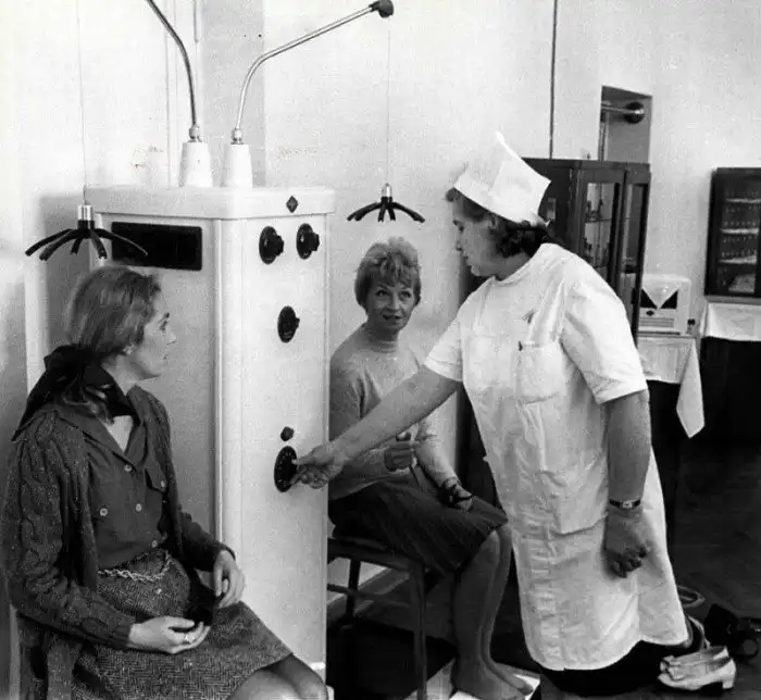 Советский врач в Сочи снимает головную боль у двух американских туристок с помощью медицинского оборудования, 1970 год.