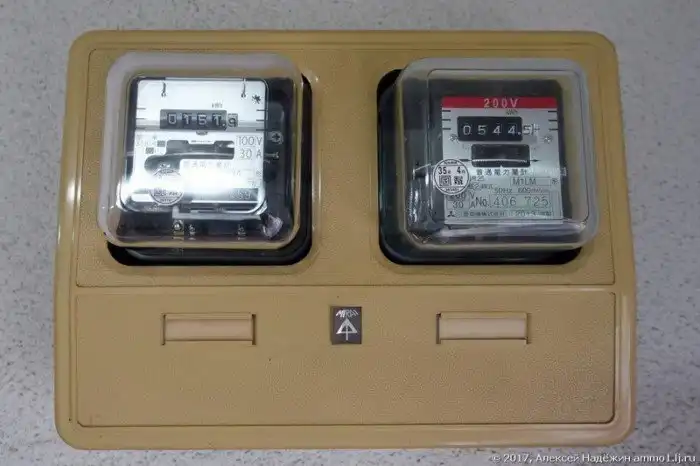 Напряжение в сети отличается от всех - 100 Вольт 50 Герц (в Америке с такими же вилками 110 В 60 Гц, у нас и в Европе 230 В 50 Гц). Из-за такого низкого напряжения и электроприборы меньшей мощности, например чайник, которым я пользуюсь, имеет мощность всего 900 Вт (дома у меня чайник 3000 Вт). Но, самое удивительное, что во многих квартирах сразу два напряжения - 100 вольт и 200 вольт, поэтому и электросчётчиков два.