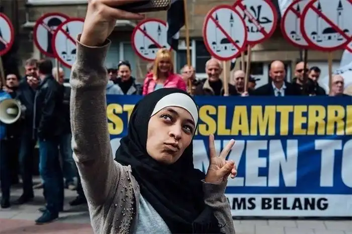 Мусульманка делает селфи на фоне антимусульманской демонстрации в Антверпене, Бельгия, 2016