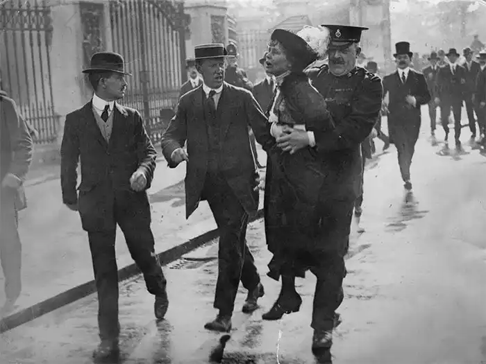 Суфражистку (участницу движения за предоставление женщинам избирательных прав) Эммелину Панкхёрст арестовывают на демонстрации, Лондон, 1914. Только в 1928 году на территории Британской империи женщины были уравнены в избирательном праве с мужчинами