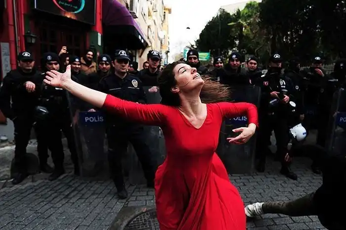 Девушка танцует перед полицией на демонстрации против выселения из "просевшего" здания, Стамбул, 2014