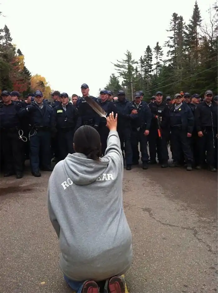 Женщина просит полицейских не применять силу на протестующих в Нью-Брансуике, Канада, октябрь 2013. Протест против добычи сланцевого газа.