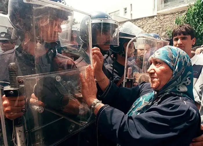 Пожилая женщина пытается сдерживать полицейских на митинге за культуру и демократию, Алжир, 2011