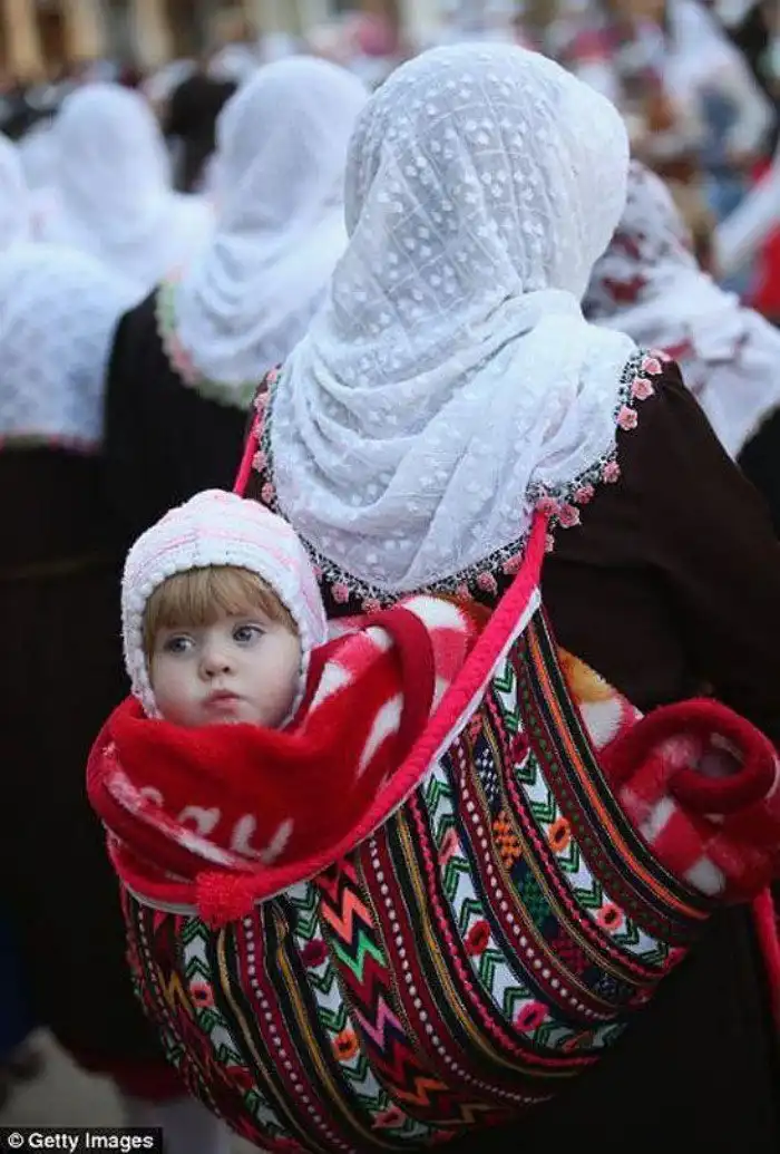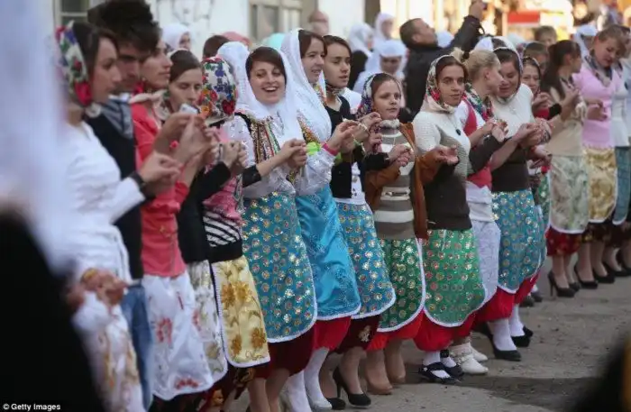 Жених, мать невесты и ее бабушка ведут молодую, одетую в яркий корсет и мешковатые штаны, к ожидающим гостям. Невесте запрещено открывать глаза до тех пор, пока священник не благословит юную пару. Сложно сказать, когда именно появилась эта традиция. Жители деревни сталкиваются с бОльшими трудностями, чем большинство мусульман в Болгарии.