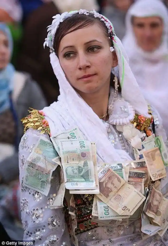 Семья будущей невесты копит приданое со дня рождения девочки. Большая часть приданого – это вязаные вещи ручной работы, лоскутные одеяла, книги, носки и ковры. Утром перед свадьбой члены семьи устанавливают деревянный помост 50 метров в длину и 3 метра в высоту и развешивают на нем приданое.