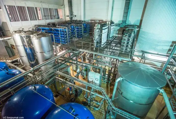Цех подготовки воды. Её берут из нескольких артезианских скважин глубиной 190 и 320 метров и фильтруют, достигая таким образом оптимального соляного состава. Всё свойства и состав воды строго соответствуют необходимым нормам.