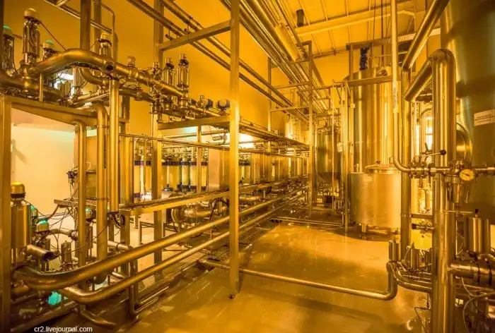 Баланс белого не уехал, в цеху фильтрации такой свет. Оборудование кажется золотым, но на самом деле оно из пищевой нержавейки. Фильтрация избавляет пиво от остатков дрожжей и оно становится прозрачным.