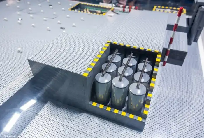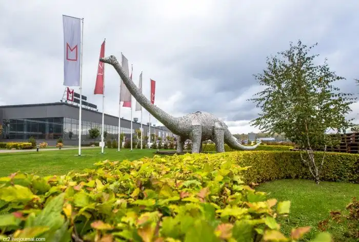 Завод под суровой охраной — динозавр из пивных банок строго следит за порядком.