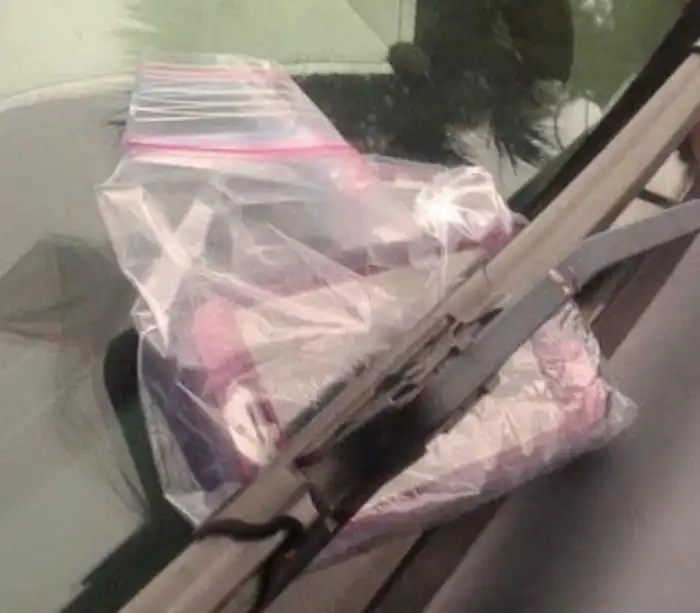 Владелец телефона забыл его на капоте собственной машины. Случайный прохожий, увидев телефон, обернул его пакетом, чтобы аппарат не промочило дождем, и убрал под дворник, чтобы не упал, и чтобы владельцу было проще его заметить.