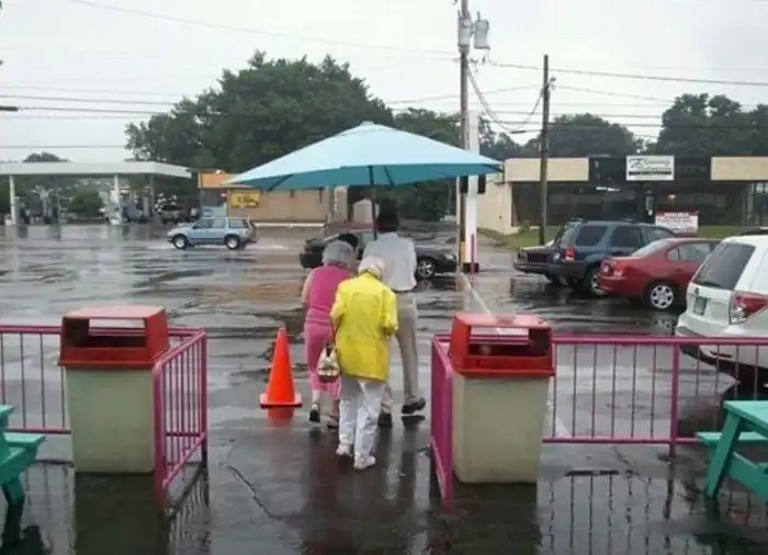 Джентльмен взял огромный зонтик, укрывавший столик в кафе, чтобы проводить трех старушек до машины под дождем.