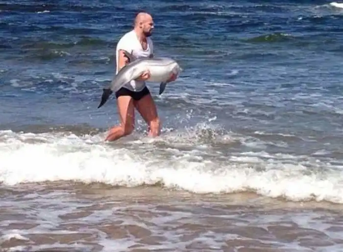 Мужчина спасает дельфиненка, выброшенного на берег штормом.