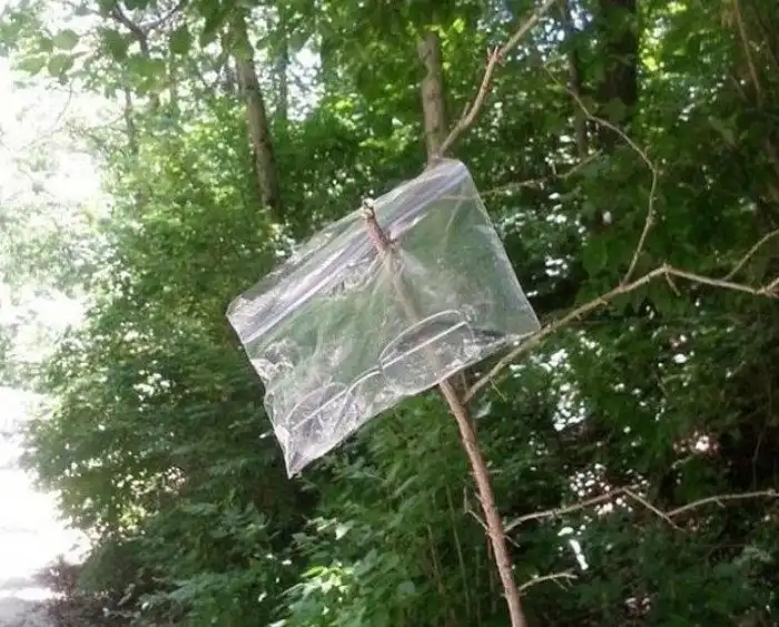 Увидев очки, явно потерянные кем-то на улице, добрый незнакомец положил их в пакет и повесил повыше на ветку, чтобы все проходящие и проезжающие могли их заметить.