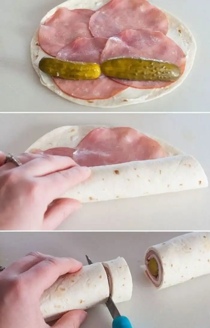 На лаваш выкладываем соус, колбасу, огурчик, сворачиваем все в трубочку и нарезаем кольцами.