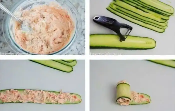 Для этого блюда понадобится большой огурец, паштет или любой соус с кусочками овощей и зубочистка.