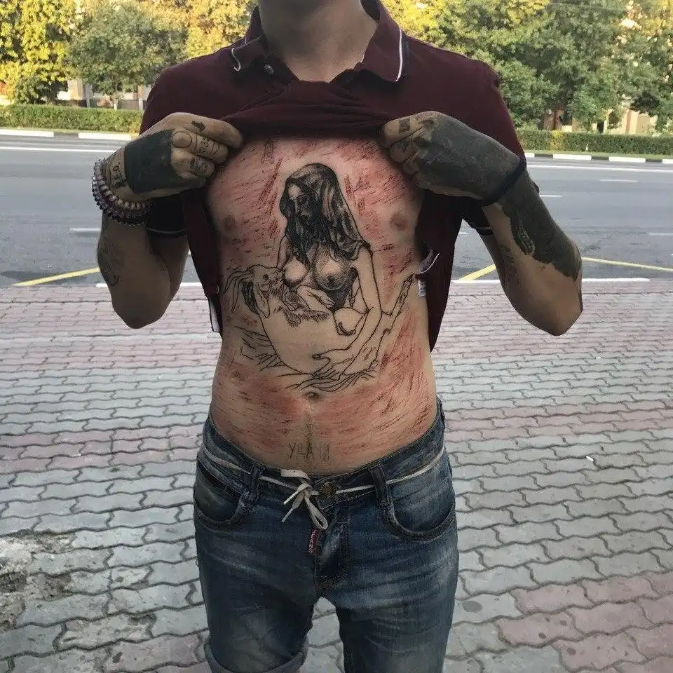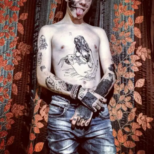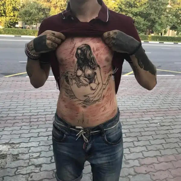 Парень из Белгорода, покрывший свое тело татуировкам разной степени художественной ценности, считает что таким образом он выражает социальный протест. Единственная тату о котором он сожалеет, это кривая надпись на лбу. Все остальные он намерен проносить на своем теле всю оставшуюся жизнь.