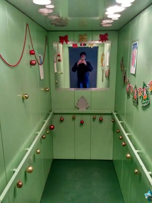 В преддверии Нового года многие из нас находятся в предвкушении праздника и хотят поделиться своим настроением с другими. Вот и жильцы одной из квартир обычного жилого дома решили напомнить о приближении любимого всеми праздника своим соседям и украсили лифт.