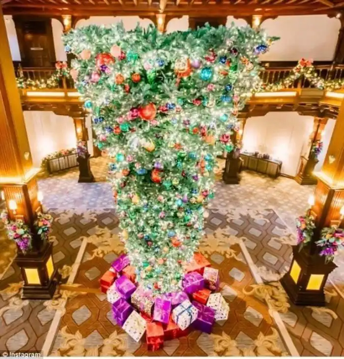 Разноцветные ели - не единственный модный тренд. Популярны рождественские елки, установленные "вверх ногами" - такие украшают холлы многих отелей и комплексов.