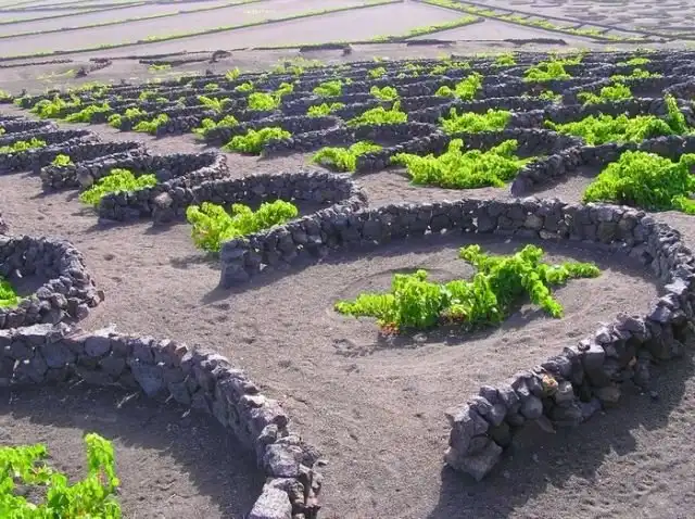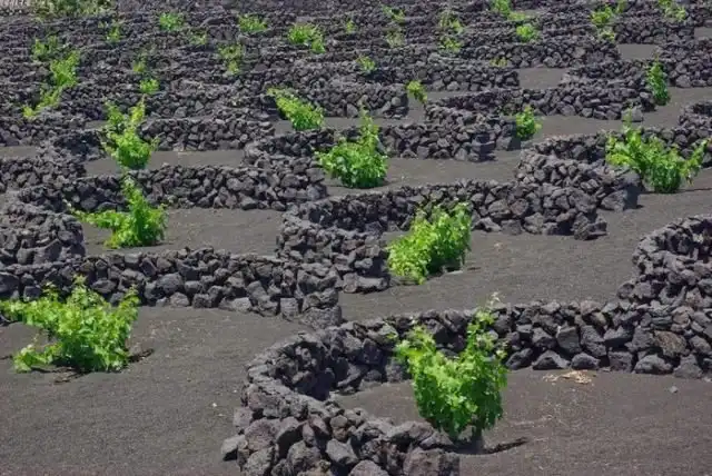 На испанском острове Лансароте у берегов Западной Африки используется уникальная технология выращивания винограда, которую не найти ни в одном другом регионе. Виноградные кусты здесь обложены камнями вулканического происхождения, что выглядит весьма необычно. А сделано это потому, что камни впитывают влагу из воздуха, выпускают ее в землю и предотвращают испарение. Это исключает необходимость искусственного орошения и к тому же защищает кустарники от ветров. Таким образом виноград здесь выращивается уже не первое столетие, что привело к развитию виноделия и процветанию данного острова.