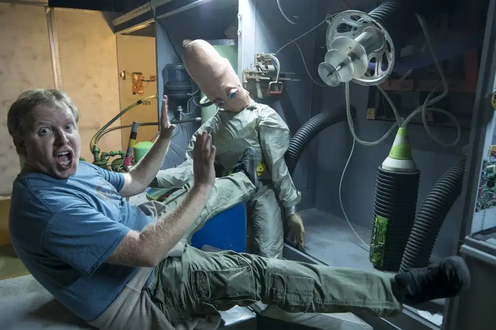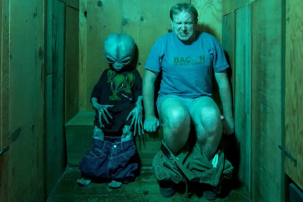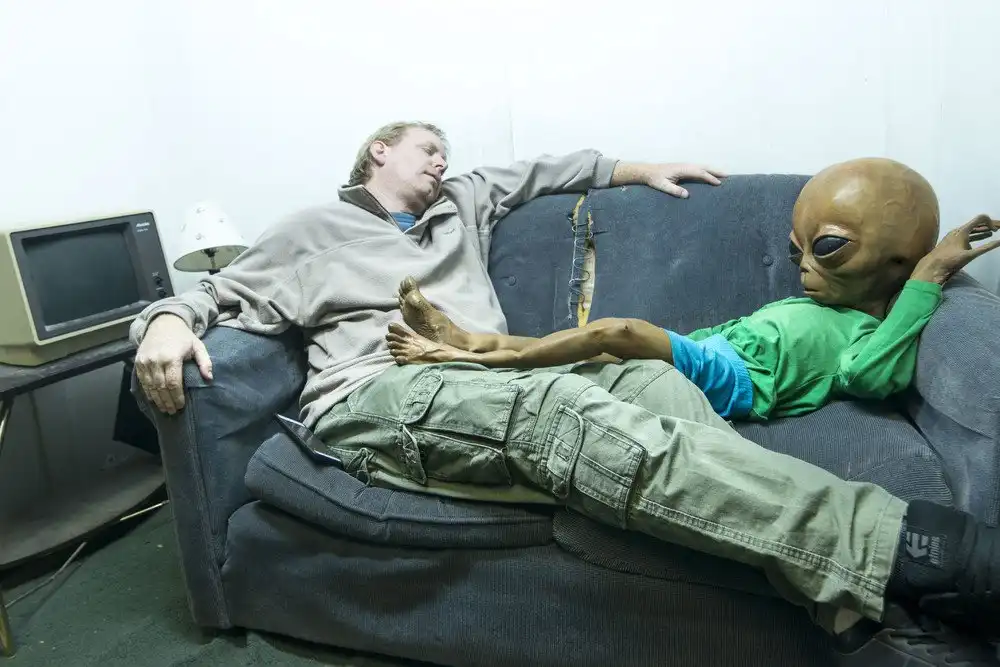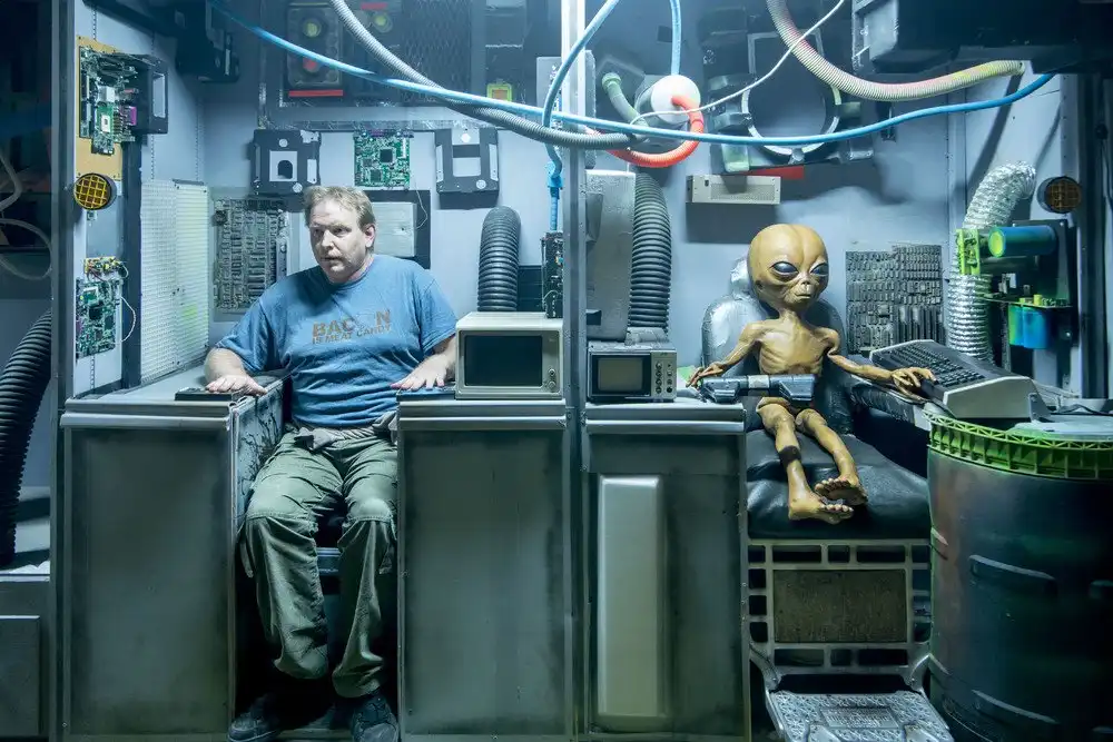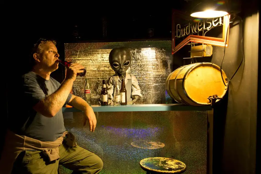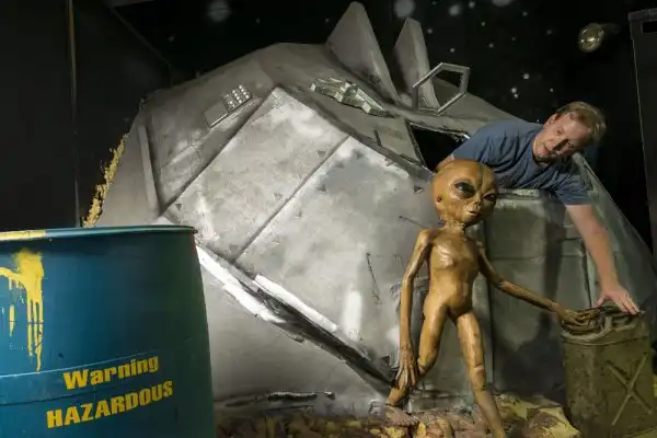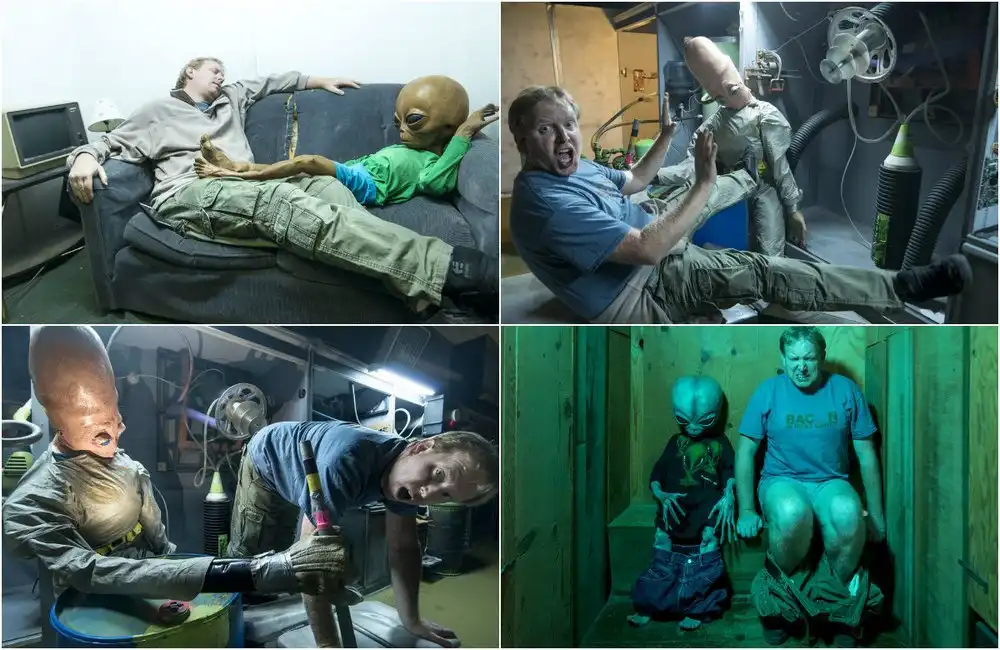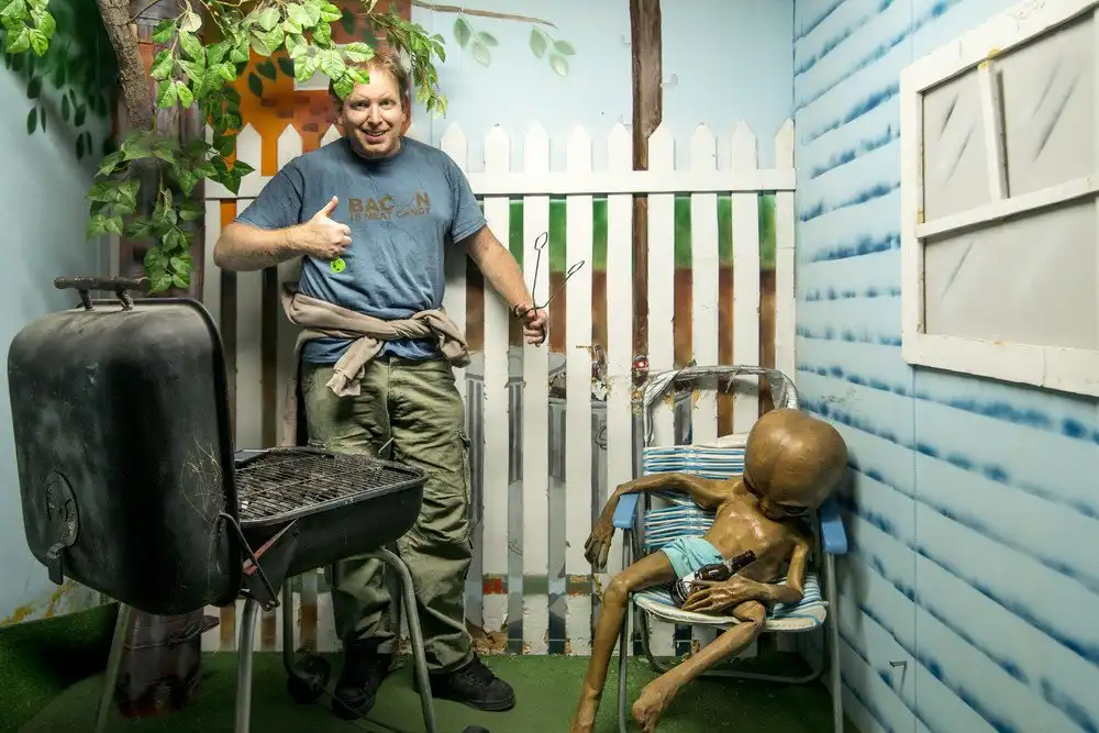 42-летний британец Крис Бертон (Chris Burton) давно мечтал посетить Музей НЛО в городе Розвелл, штат Нью-Мексико, США. Наконец его мечта осуществилась, но что-то пошло не так и Крис оказался заперт в музее. Чтобы скоротать время, он начал делать фотографии с инопланетянами. Получались довольно забавные снимки.