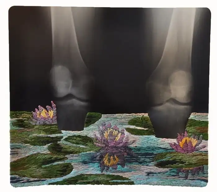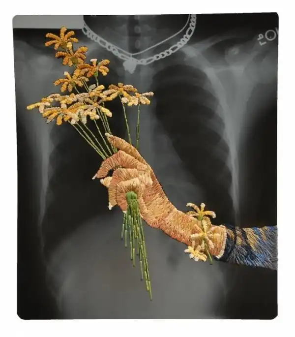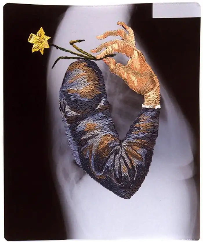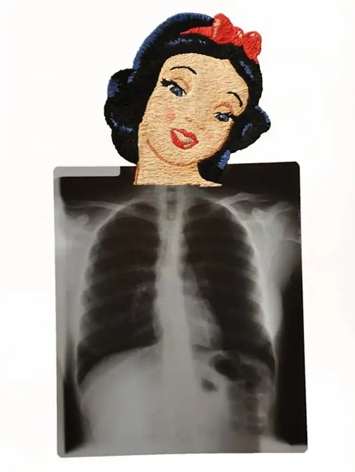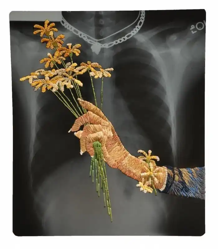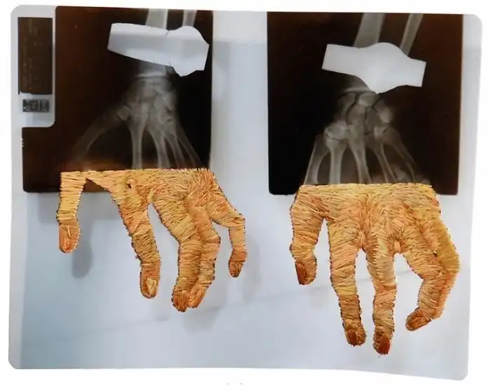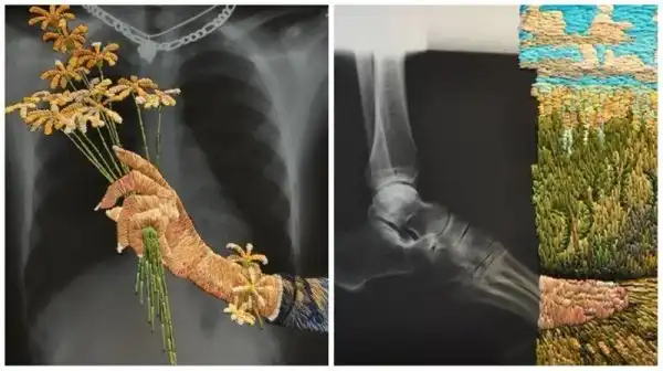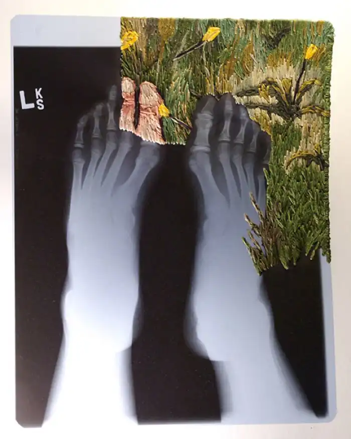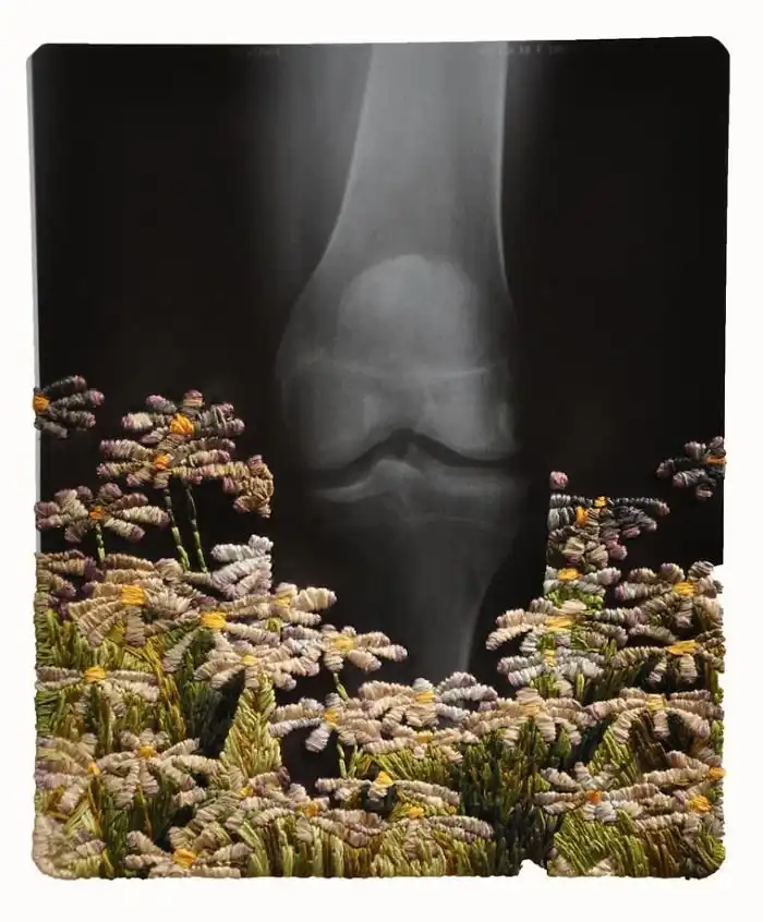 Американский художник Мэтью Кокc создает необычные коллажи, оживляя черно-белые рентгеновские снимки с помощью яркой вышивки. Эти цветные дополнения - словно недостающее звено в рассказе. Контраст холодного пластика и теплой ткани наводит на мысли о заботе и врачебной помощи, рождая надежду на скорейшее выздоровление.