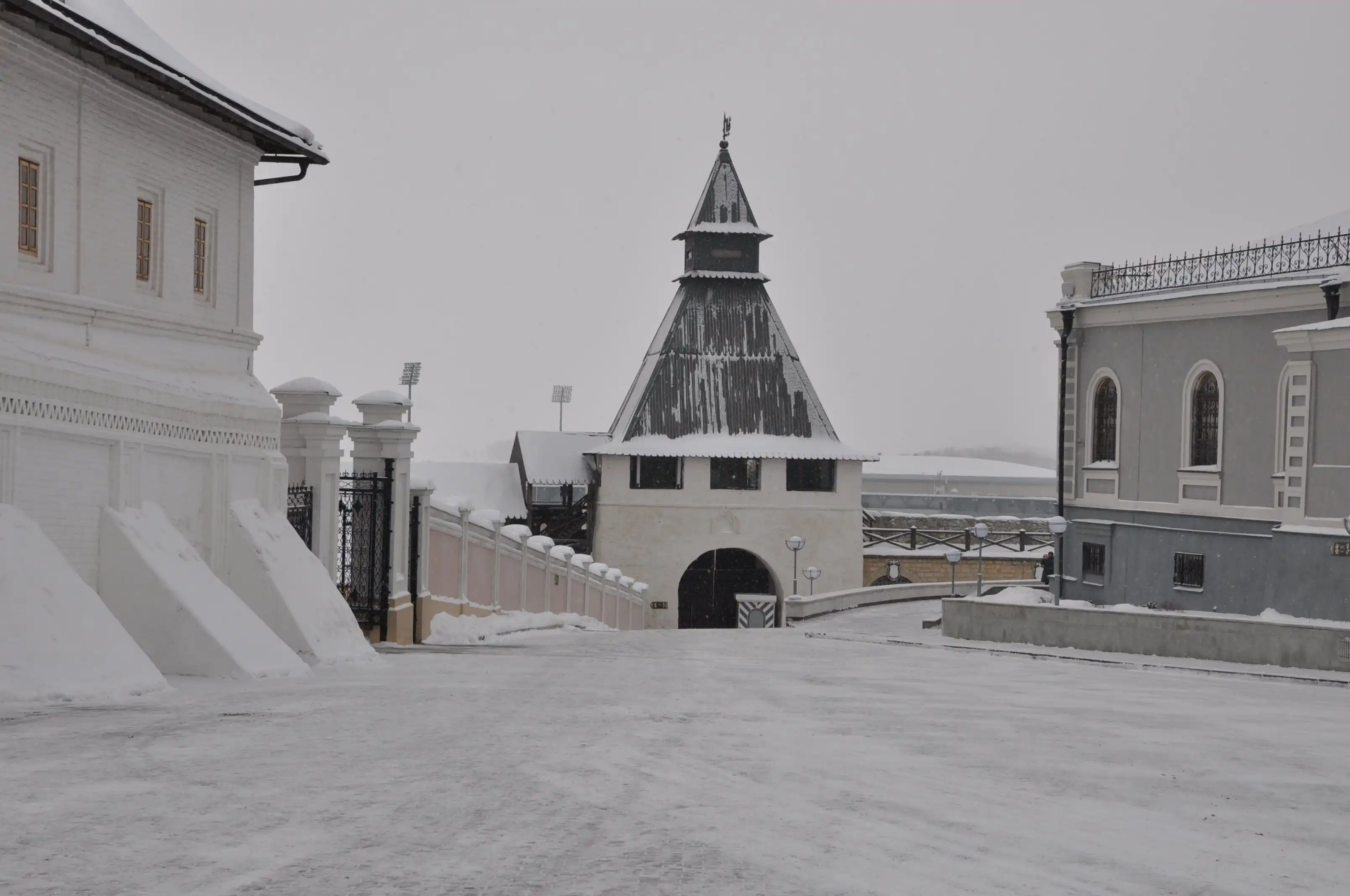 Тайницкая башня Казанского Кремля. Тайницкой она называлась потому, что на этом месте был тайный подземный ход к источнику, благодаря которому Казань выдерживала долгие осады. Говорят, войска Ивана Грозного во время осады Казанского Кремля взорвали эту башню, ход к источнику был засыпан, и лишь тогда Казань пала. Тайницкая башня в её теперешнем варианте была построена во 2-й половине ХVI в. Как проездная, её ворота использовались для выхода на берег реки Казанки.