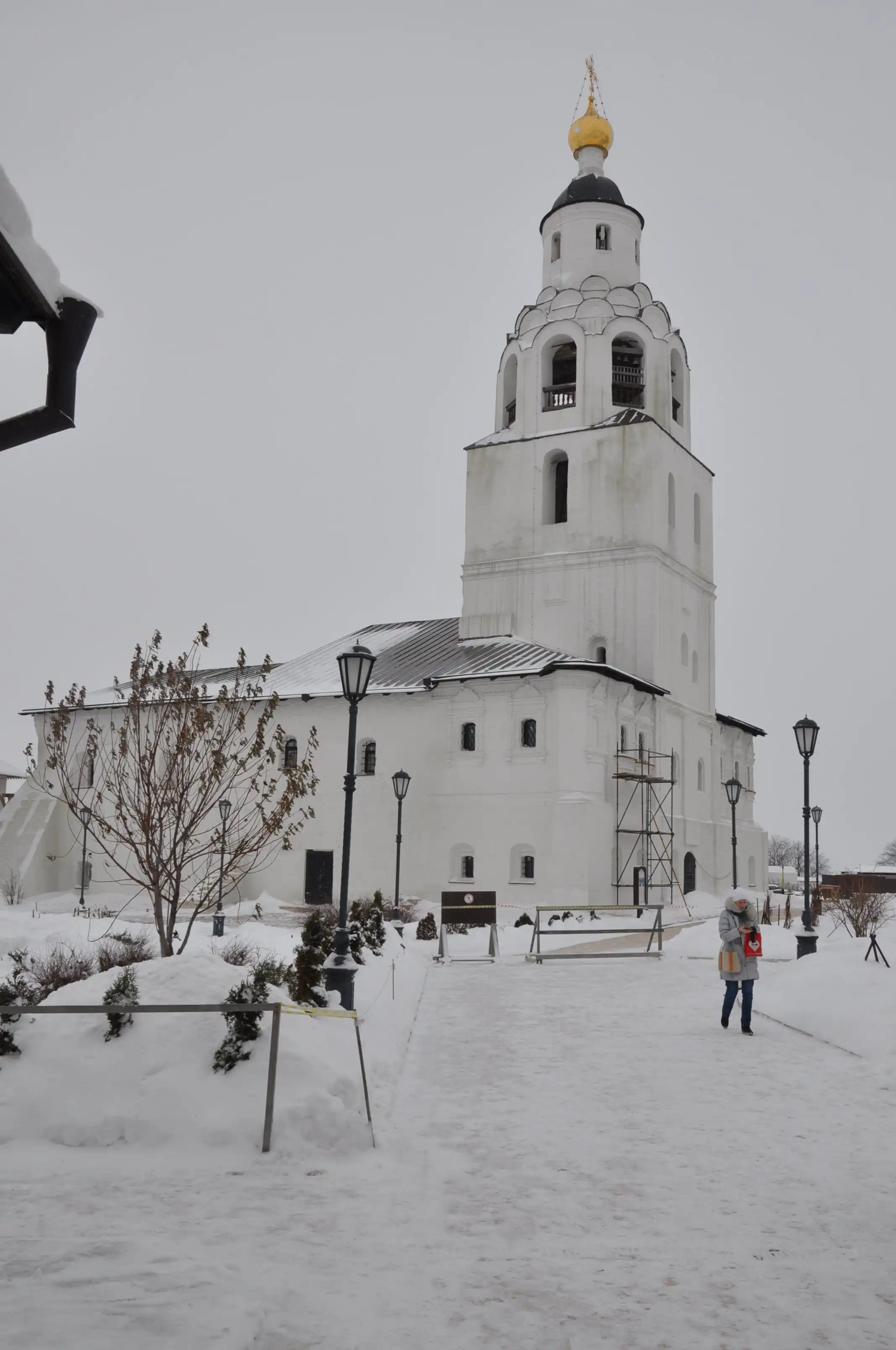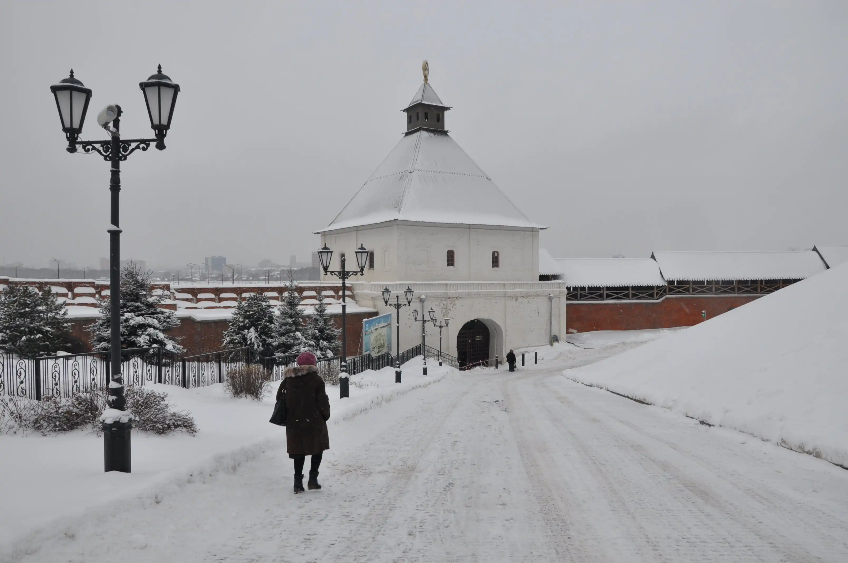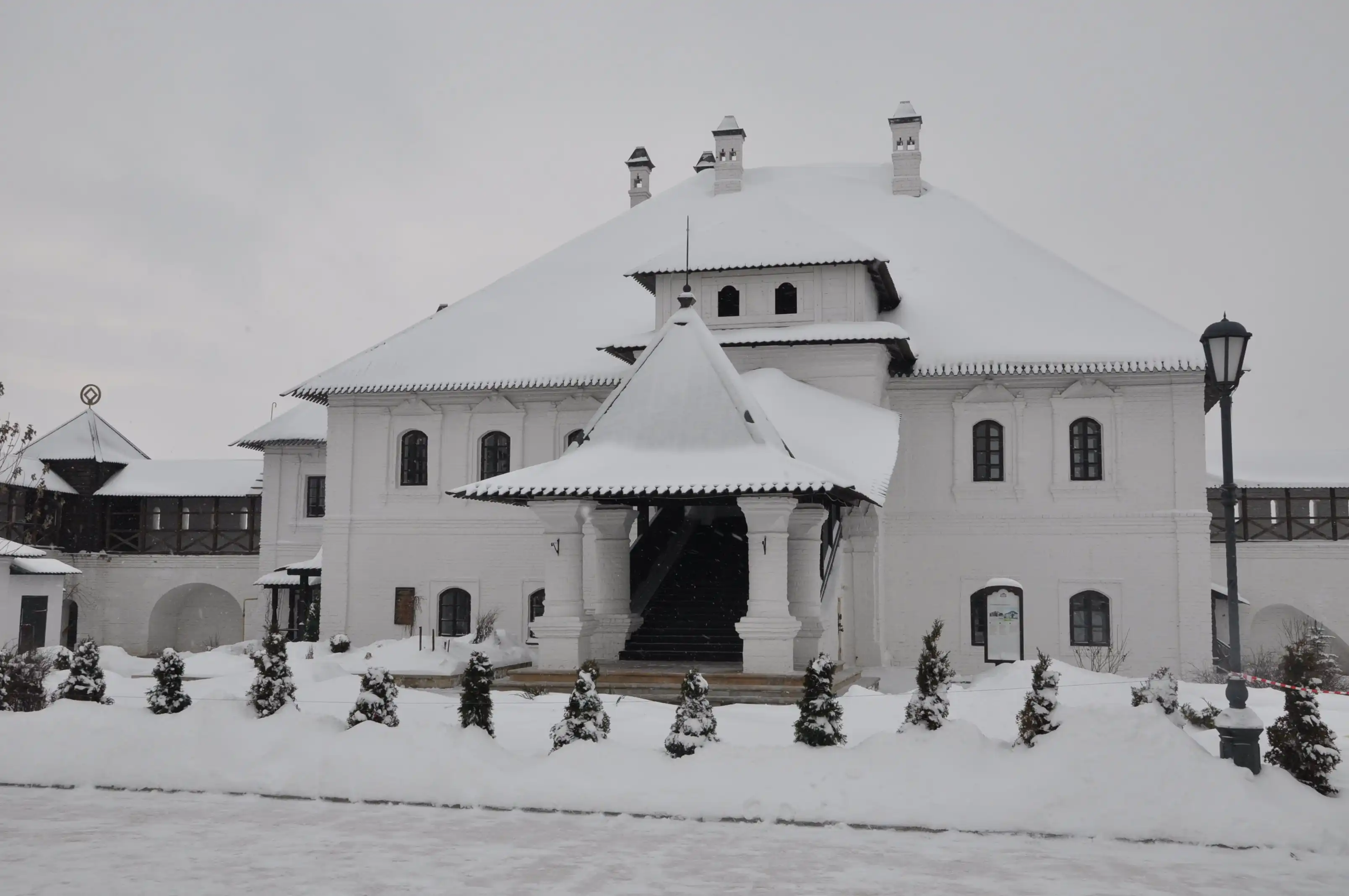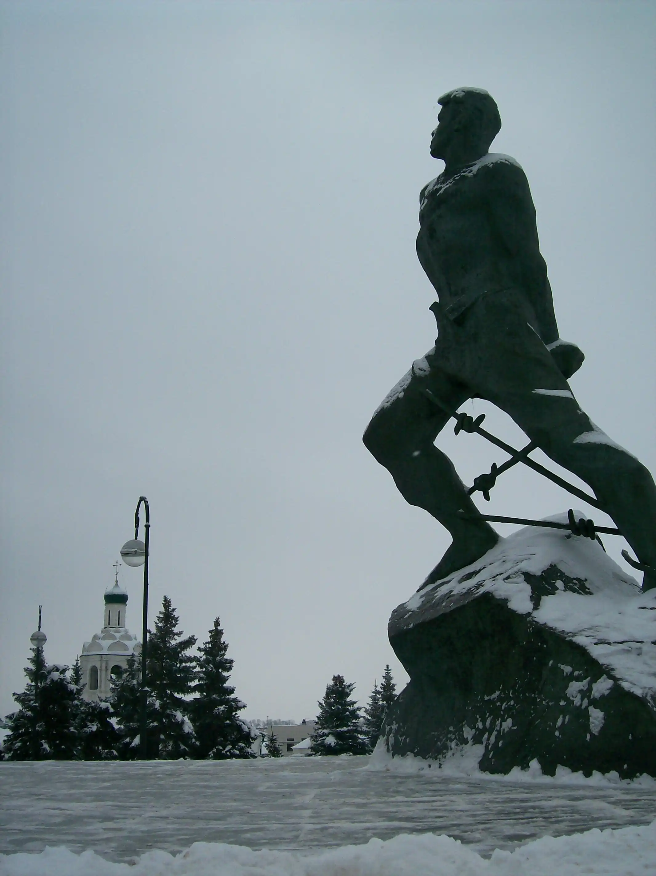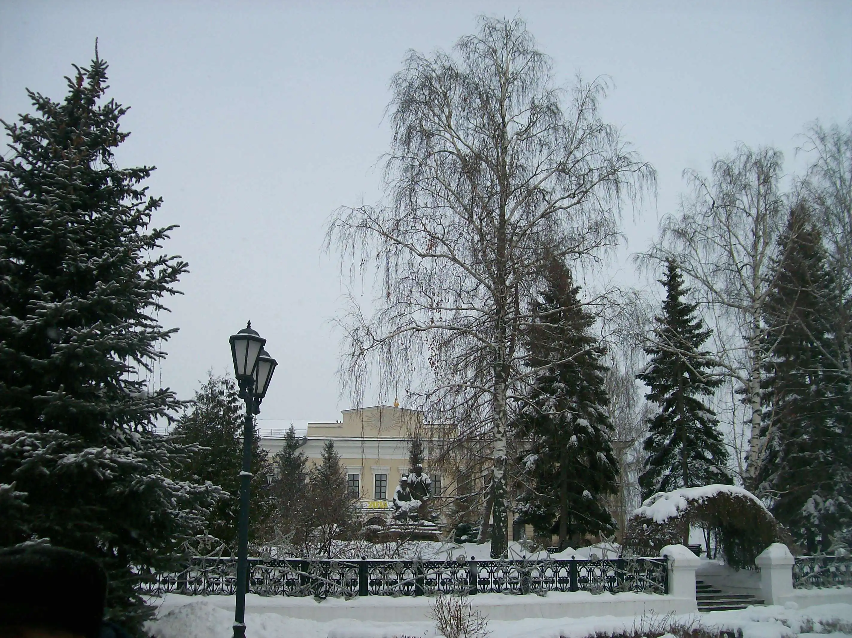 Это фактурное здание с колоннами на холме – музей истории Гражданской войны. Мы туда не ходили, но краем уха слышали много чего интересного – оказывается, в Свияжске был аэродром, с которого аэропланы в гражданскую войну бомбили Казань. Во всём этом был как-то замешан Троцкий. Ах, да. Он отличился тем, что приказал установить в Свияжске памятник Иуде искариоту, как первому революционеру (?!). Честно говоря, нам, слегка обалдевшим от холода во время двухчасовой прогулочки по открытой всем ветрам возвышенности, да ещё окруженной со всех сторон водой, просто понравилось нарядное здание музея. Народ!!! В Казани – мороз! Ночью было минус 18! Снега по колено! Это просто подарок какой-то (наверно, новогодний) после нашей прочно застрявшей в межсезонье Москве! Здесь резко континентальный суровый климат и волжские дали до горизонта…