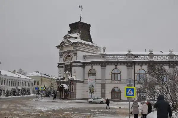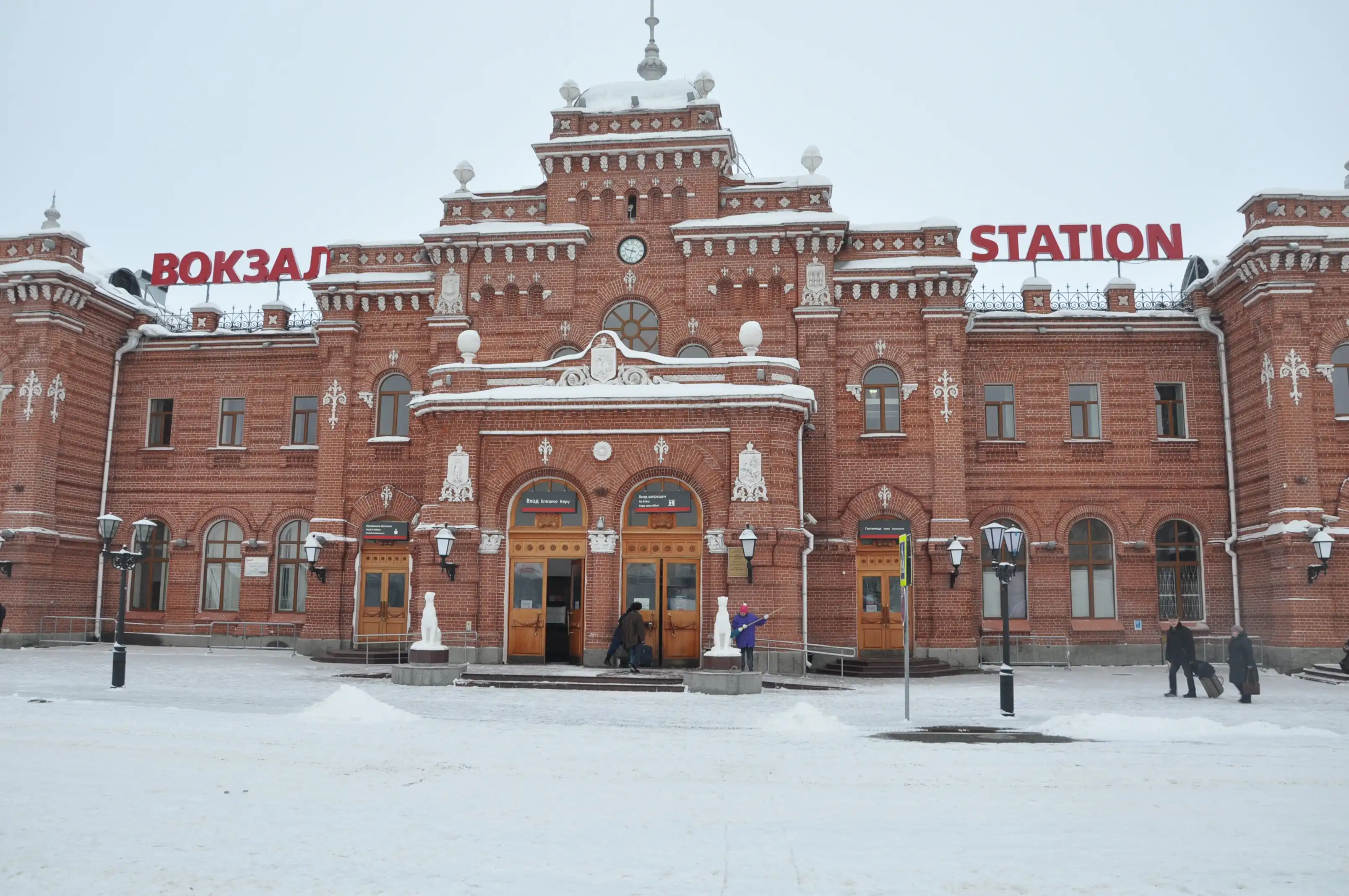 Наше знакомство с Казанью началось вот с этого симпатичного здания железнодорожного вокзала. Это так называемое старое здание, потому что есть ещё терминал № 2, «Казань-Восстание. . А кому надо побыстрее – летите самолётом, и приземлитесь в международном аэропорту «Казань». Красное здание вокзала в Казани считается памятником архитектуры начала ХХ века. Его центральный вход украшают статуи белых барсов, кстати, любимый символ в Татарстане – и на гербе республики белый барс с крыльями и национальный банк называется «Ак Барс Банк», хотя барсы здесь отродясь не водились. эта символика восходит к истокам Татарстана – Барс был покровителем кочевых племён, пришедших на Волгу откуда-то из Причерноморья и основавших исламское государство Великая Булгария. Кстати, сейчас средствами благотворителей республики идёт восстановление древнего города Великий Булгар, который находится где-то в стороне от Казани – местное население очень чтит свои исторические корни.