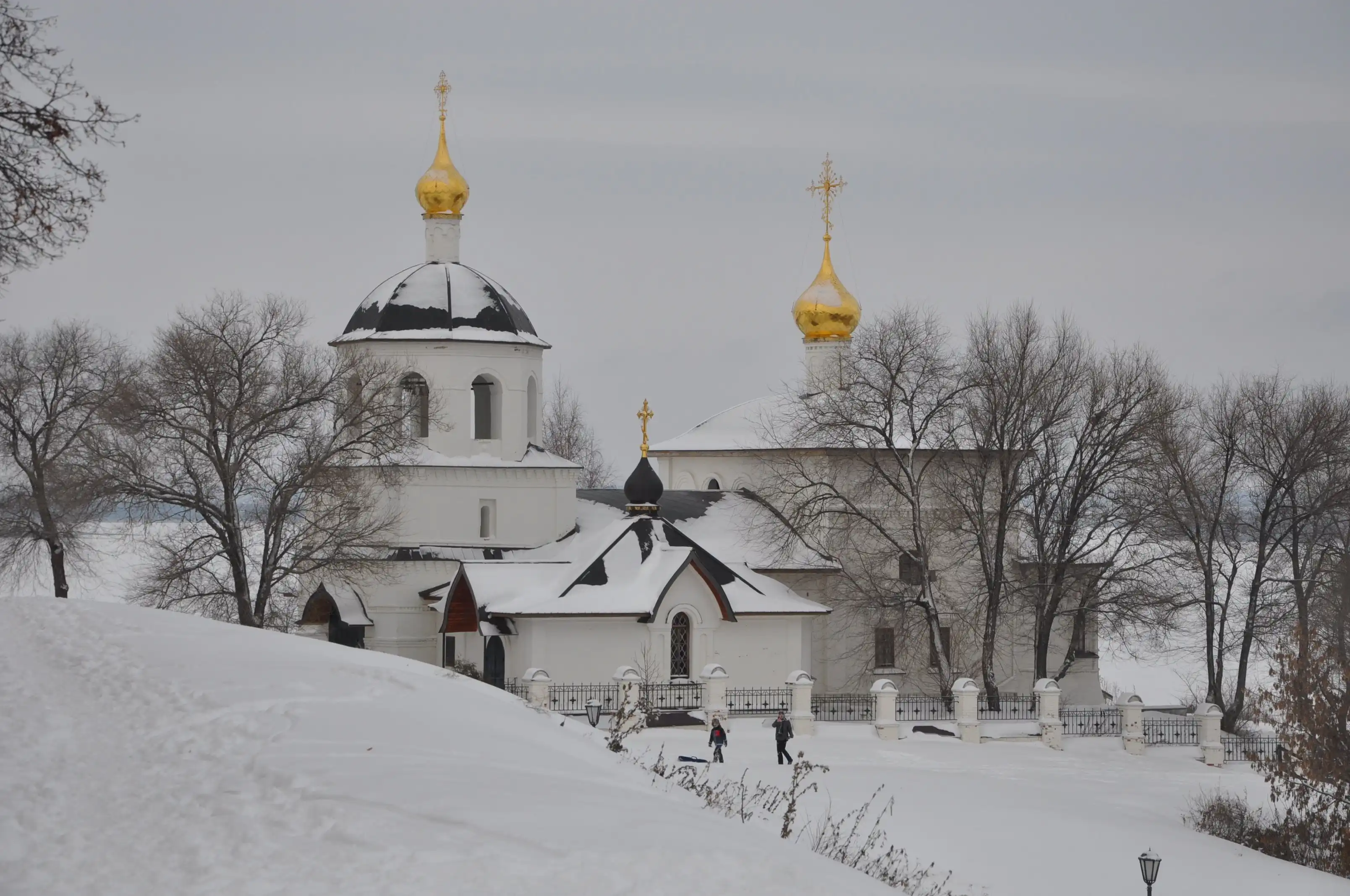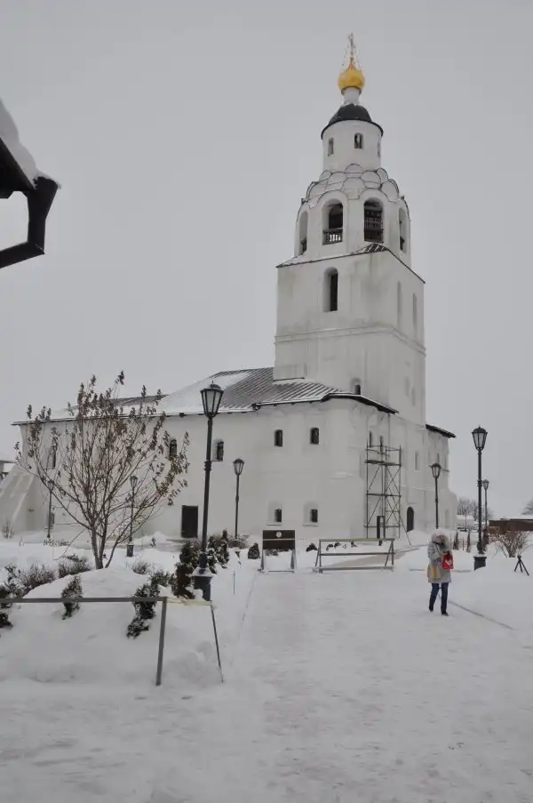 Вот так, длинной вереницей, пешим строем мы возвращаемся вдоль стен Богородице-Успенского мужского монастыря к своему брошенному где-то под крутым холмом экскурсионному автобусу, последний раз оглядываясь на бескрайние волжские дали. До свидания, заснеженный Свияжск! До свидания, лебёдушка-Казань!