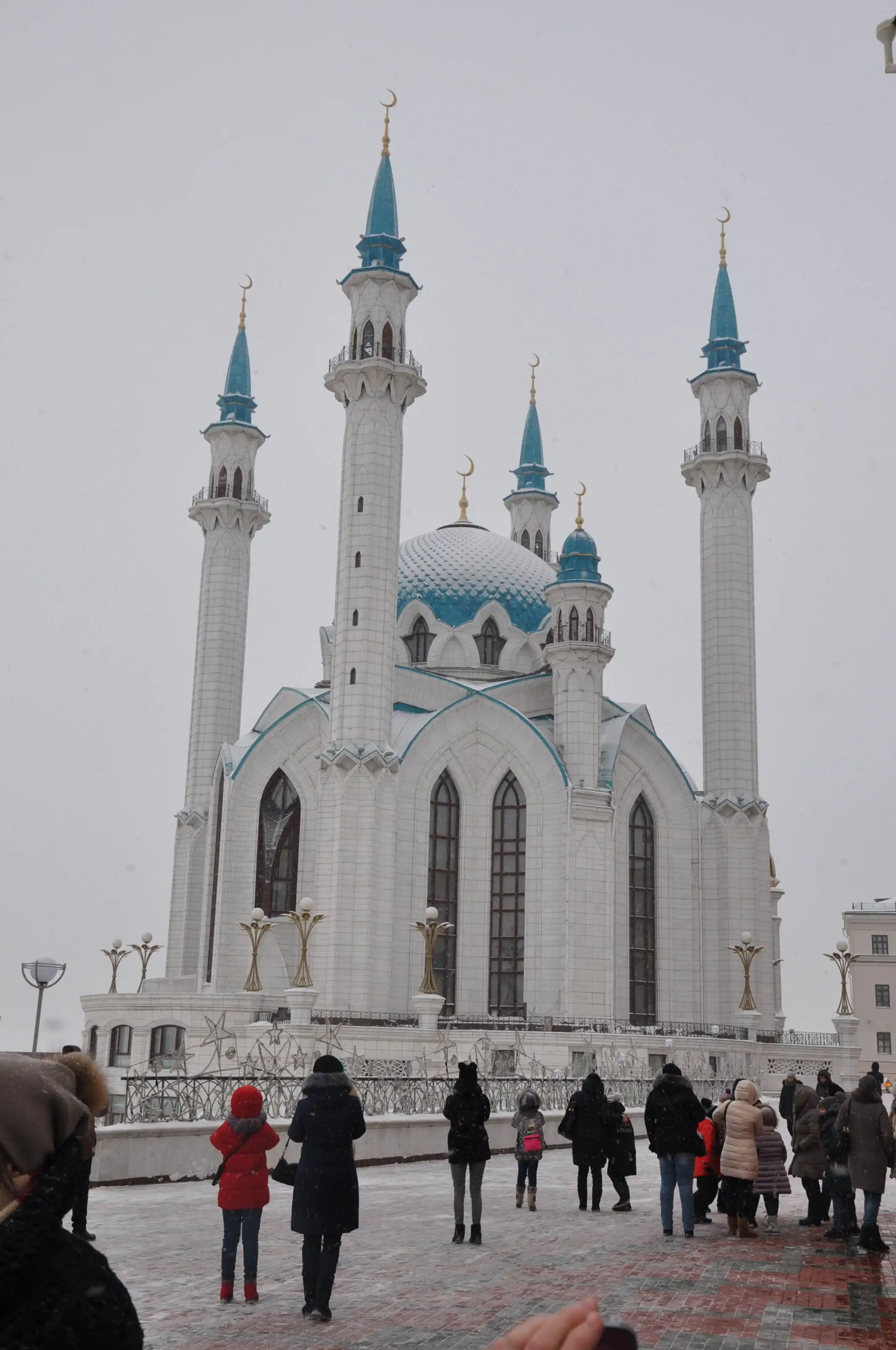 Это – парадная соборная мечеть Татарстана Кул Шариф, построенная по указу Президента Татарстана М.Шаймиева в 1995-2005 гг. Мусульманская конфессия в начале 1990-х годов обратилась к нему по поводу явной несправедливости: почему на территории Казанского Кремля есть Православный собор и нет мечети, тогда как ислам является исторически традиционной религией татарского населения? Ведь Татарстан населяет 48% процентов русских и 47% татар, значит, и храмов должно быть поровну. Президент дал добро на воссоздание старинной мечети Кул-Шариф, разрушенной по приказу Ивана Грозного. Новая мечеть, по замыслу Президента, должна была стать не только религиозным, но также культурно-просветительским и научным центром. Она должна была стать доминантой Казанского Кремля и по масштабам соответствовать Благовещенскому собору. Реализация идеи осложнялась тем, что не сохранилось не то что описаний и чертежей, но и ни одного изображения этой древней мечети. Поэтому её проект пришлось разрабатывать заново с использованием национальной и традиционной исламской символики. Стиль Кул Шариф – не татарский, он ближе к архитектуре Ирана и других ближневосточных стран. Татарские мечети обычно с одним минаретом и довольно скромные в декоре – чаще всего это прямоугольные двухэтажные здания. Мечеть Кул Шариф – круглая в плане, с четырьмя минаретами и замысловатой резьбой по камню. Купол мечети выполнен в виде «Казанской шапки» - короны казанских ханов (такая шапка выставлена в Оружейной палате Московского Кремля). В основе планировки мечети лежит комбинаторный знак мусульманской конфессии «Бисмилла» («Во имя Аллаха») – в виде двух наложенных друг на друга и смещенных под углом 45 градусов квадратов. В декоре мечети часто встречается древнебулгарский знак возрождения и процветания «тюльпан» - под него стилизованы окна мечети. Выбор цвета кровли мечети происходил методом проб и ошибок – на минаретах несколько раз менялось навершие, прежде чем остановились на бирюзовом. Кул Шариф – парадная мечеть, и молящихся там обычно немного. Туристов пускают туда охотно, не в сам молельный зал, а на смотровой балкончик. Оттуда видны великолепные витражи и огромная затейливая люстра из чешского стекла. В нижней части мечети расположен музей исламской письменности. Название Кул Шариф происходит от имени имама Кул Шарифа, мусульманского богослова и самоотверженного защитника Казани, который погиб во время штурма Казани Иваном Грозным. Вообще, русские в своё время пришли сюда как завоеватели. Местные прекрасно об этом помнят. Однако отношение к «руссо туристо» на удивление доброжелательное и даже заботливое. То ли соотношение населения почти 50 на 50 играет свою роль, то ли бизнес, понимаешь…
