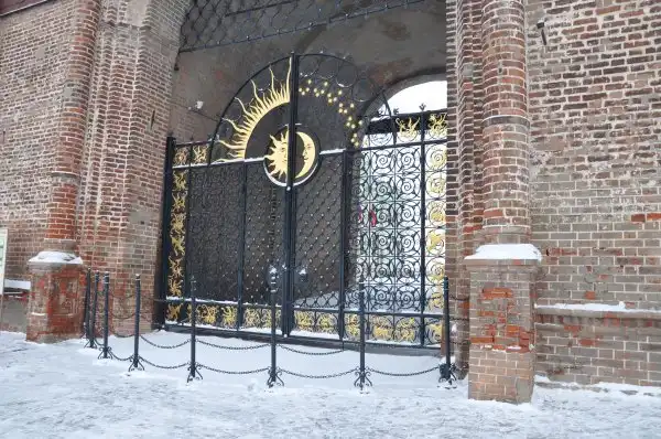 Декоративные ворота в проездной арке башни Сююмбике. Они появились в 2004 г., потому что башня вплотную прилегает к официальной резиденции Президента Татарстана. В аллегорических украшениях ворот зашифрованы национальные татарские символы: солнце и полумесяц олицетворяют день и ночь, над ними расположены представители зодиакального круга, в зооморфном орнаменте по периметру ворот встречаются Ак Барс – покровитель татарского народа, Дракон Зилант – хранитель Казани, лебедь – символическое изображение царицы Сююмбике и утка с комком глины в клюве, символизирующая татарскую легенду о сотворении мира.