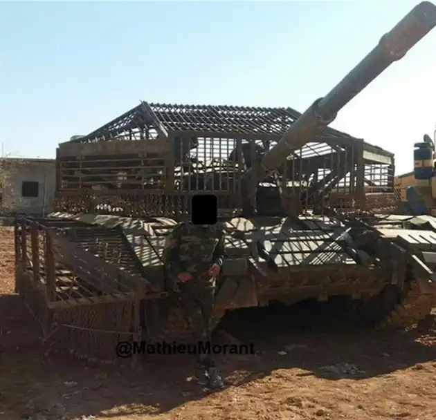Перед вами танки Т-72, которые стоят на вооружении сирийской армии и оборудованы дополнительными противокумулятивными решетчатыми экранами для защиты от кумулятивных снарядов. Подобную защиту на танки могут устанавливать и заводы-изготовители, но в данном случае она изготовлена кустарным способом, о чем свидетельствуют ее размеры. В идеале экраны установлены вплотную к броне танка и это не выглядит так, будто бы боевую машину поместили к клетку.