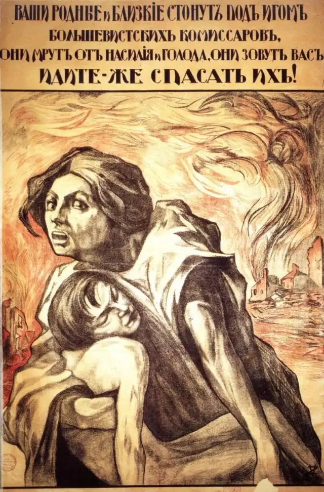 В годы гражданской войны агитационные плакаты активно использовались не только большевиками, но и белогвардейским движением. Давайте взглянем на некоторые плакаты, которые использовали в своей пропаганде белогвардейцы.