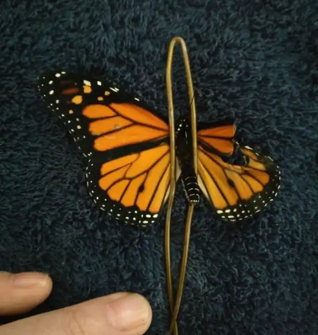 Зафиксировав бабочку проволокой, поврежденная часть крыла была отрезана.