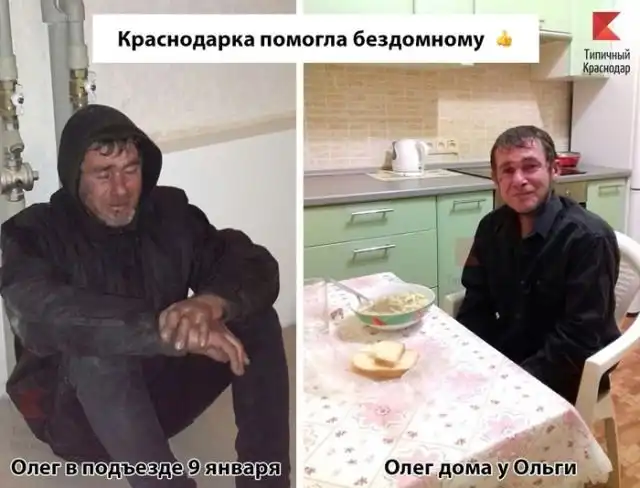 Жительница Краснодара по имени Ольга помогла вернуться на родину 42-летнему гражданину Казахстана, который вел бродячий образ жизни. 9 января женщина обнаружила бездомного в подъезде своего дома. Она познакомилась с мужчиной, который представился Олегом, и с помощью социальных сетей ей удалось выйти на его родственников. Оказалось, что Олег приехал в Краснодар из Симферополя. Ему обещали работу, но в итоге отобрали документы и телефон, он сбежал и стал бродяжничать. Женщина оставила бездомного у себя, а 12 января за ним приехали брат и дядя, которые забрали его домой.