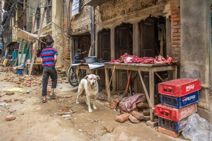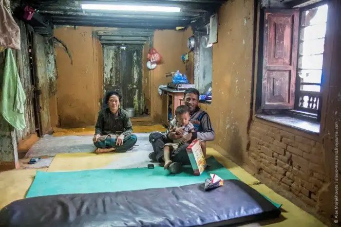 Семья Сурьи снимает комнату в трущобах самого центра Катманду, чтобы быстрее на велорикше добираться до туристических районов. Мы остановились у стены с очень низкой аркой, ведущей в тесный, квадратный дворик. Мне пришлось сильно наклониться, чтобы не удариться головой о полусгнившие деревянные балки, поддерживающие кирпичную кладку.